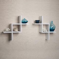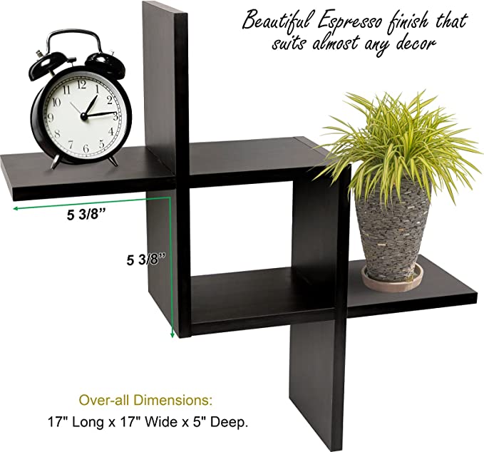 - Creative Criss Cross Floating Shelves- A great decorative solution for small areas or challenging wall spaces like dorm rooms or a home office! Beautiful Espresso finish that suits almost any decor.